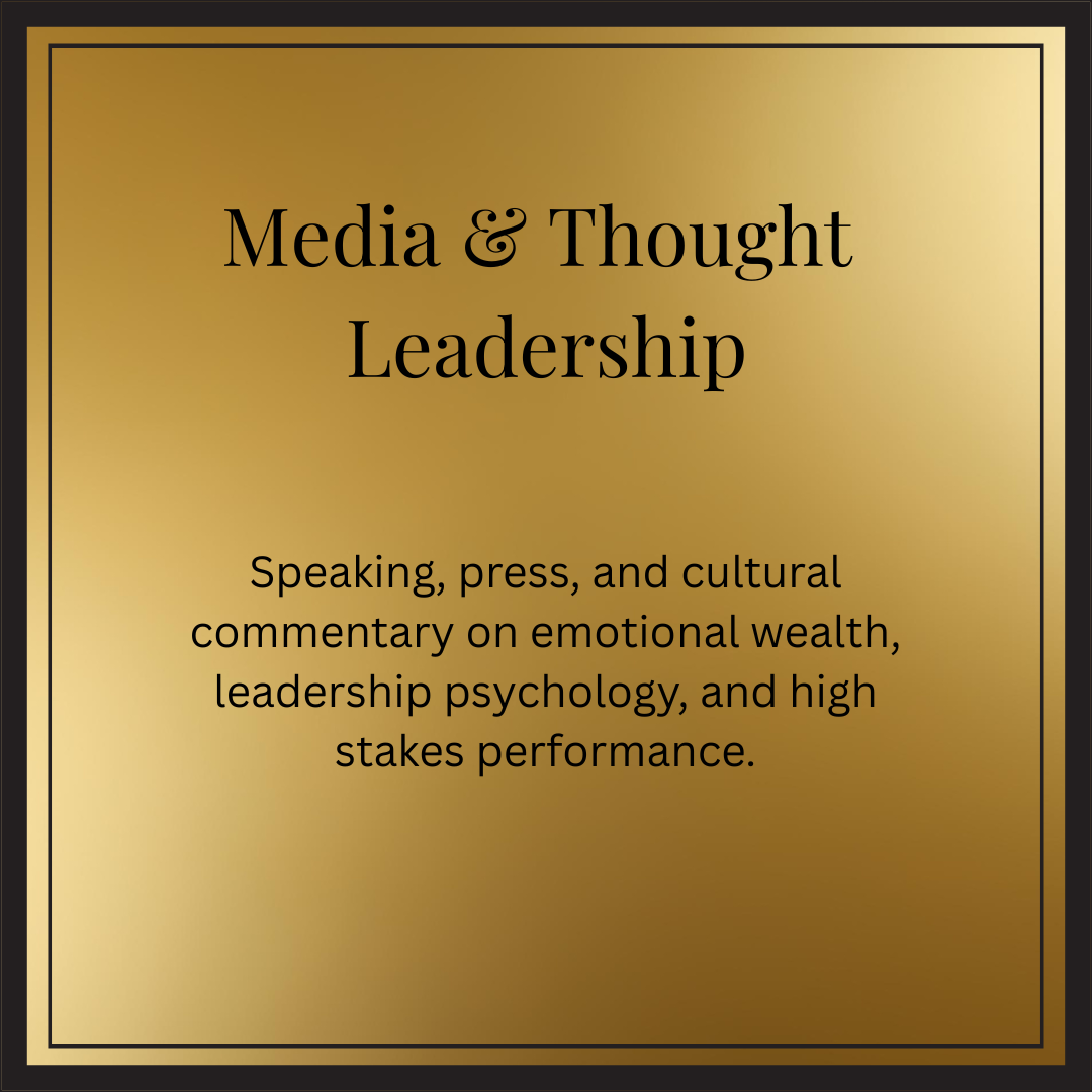 Her clients include founders, executives, athletes, public facing leaders and cultural figures who require privacy, precision, and psychological containment.
